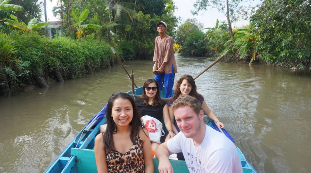 Afterwards, we visit a local house to see how the locals make rice noodle “hu tieu”. On the way back, we can visit Cocoa garden to see first-hand how the locals make fresh chocolate and get to taste some (entrance fee is not included). Following this, we will get back onboard the boat and journey into a very beautiful canal with a lots of water coconut on the both sides of the river. If you are interested in rowing the boat, there will be an oppotunity here to learn (depends on the tide, we can go through the canal or just. ashort distance). The tour comes to an end there. Our guide will drop you back at your hotel.